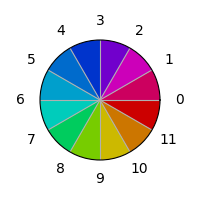 Given the structure of the musical tone space, it would be useful to have a set of 12 colours that are spaced relatively evenly. The concept of Hue is useful for this purpose as it represents a perceptually continuous cycle along the spectral colours and the line of purples on a chromaticity diagram. This section will explore how to produce an optimal set of colours with evenly distributed hues.